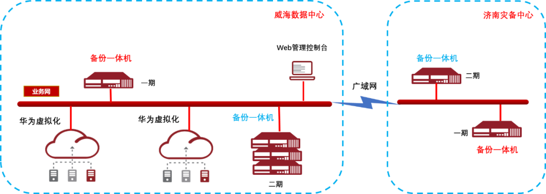 2、雙中心容災(zāi)解決方案:在威海、濟(jì)南兩個(gè)數(shù)據(jù)中心之間統(tǒng)一管理,采用鼎甲數(shù)據(jù)備份和管理軟件,將區(qū)縣政府業(yè)務(wù)系統(tǒng),通過云平臺(tái)接口統(tǒng)一備份到鼎甲備份一體機(jī)上后,將重要備份數(shù)據(jù)異步傳輸?shù)綕?jì)南災(zāi)備中心,實(shí)現(xiàn)數(shù)據(jù)級(jí)容災(zāi)。