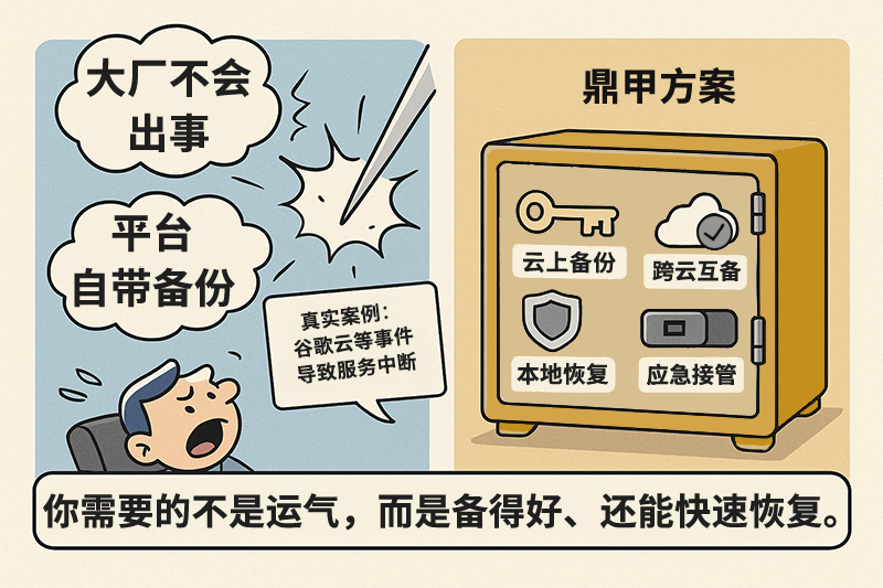 2024年,谷歌云因操作失誤誤刪 UniSuper 養老金基金賬戶,導致 62 萬用戶數天無法訪問退休賬戶,引發投訴和信任危機。部分數據因無備份永久丟失,造成業務中斷。若采用 3-2-1 備份策略,損失本可避免。