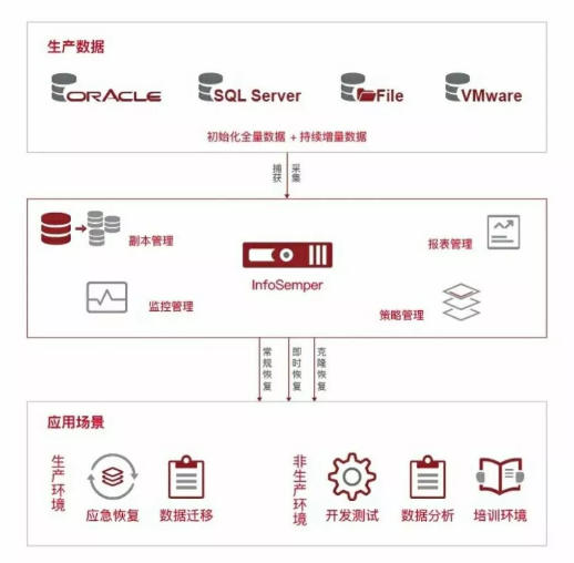 InfoSemper 利用客戶端應用資源的專用接口捕獲生產環(huán)境中的文件、數據庫等數據,基于快照數據建立多副本管理體系,通過副本掛載實現數據的即時恢復,既可以支持生產環(huán)境的應急使用,又可以支持非生產環(huán)境的開發(fā)、測試、數據分析等使用。