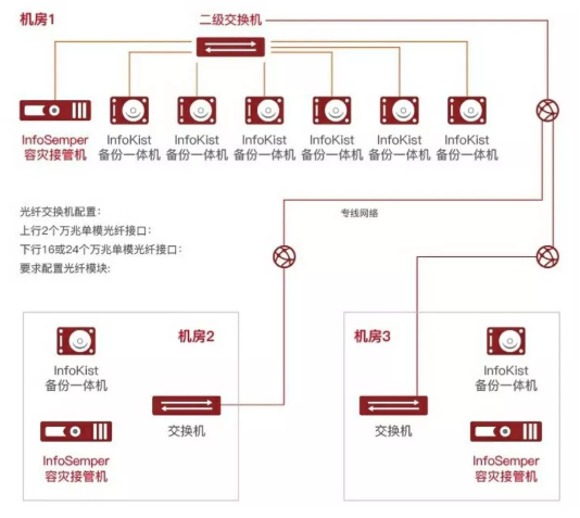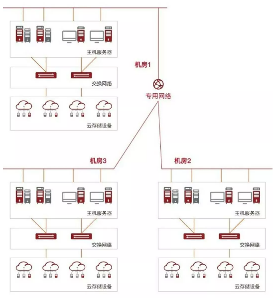 鑒于該項目涉及3大數據中心機房,因此從網絡架構設計的角度,無論是本地的數據備份,還是跨數據中心的數據復制,都需要以萬兆為核心的網絡構建,實現跨運營商的統(tǒng)一管理和數據存儲隔離。其中,數據備份首先存放在本地容災設備,再增量同步到跨機房的遠端冗余的容災設備(參加下圖)。