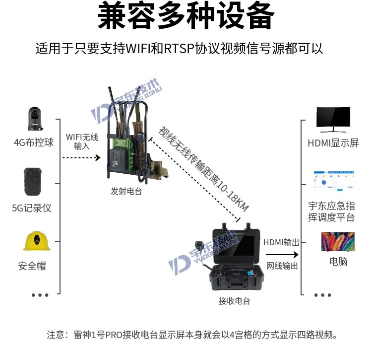 宇東技術雷神1號PRO背負式高清無線圖傳電臺,是公司針對應急救援指揮、公安、反恐作戰、消防救援、邊防執勤、海警海關巡檢、部隊拉練演習、森林消防等,在突發重大事件,斷網斷電,通信中斷的情況下,現場工作人員通過雷神1號PRO背負式高清無線圖傳電臺,把現場采集的數據實時無線傳輸到指揮車/臨時指揮部大屏幕,讓指揮部領導對現場情況一目了然,節省了到達現場的時間,可快速做緊急指揮調度,最大限度的減少突發事件帶來的各種損失,雷神2號plus單兵電臺支持雙向語音對講系統,現場工作人員可以和指揮部通話,接受領導發送的各種指令。
