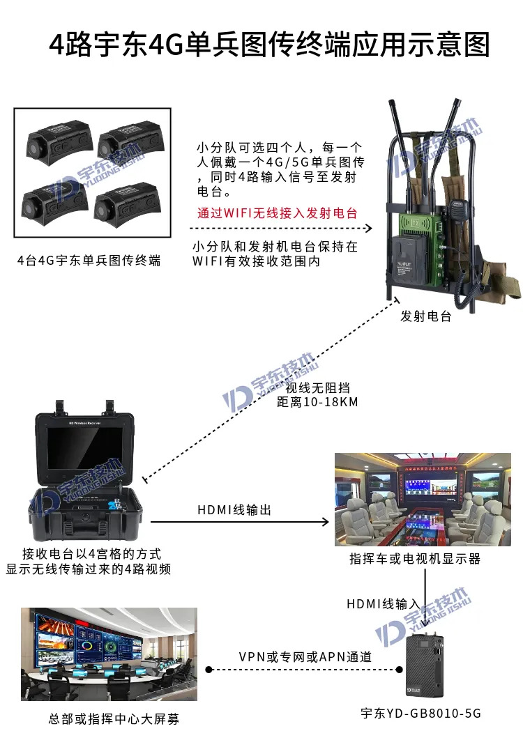 宇東技術雷神2號plus背負式高清無線圖傳電臺,就是把一線單兵的現場畫面實時的無線傳輸到指揮車/指揮部,并支持雙向語音對講,指揮員可以在指揮車/指揮部查看現場畫面,并可以和一線單兵人員對講通話,輕松完成指揮調度工作。